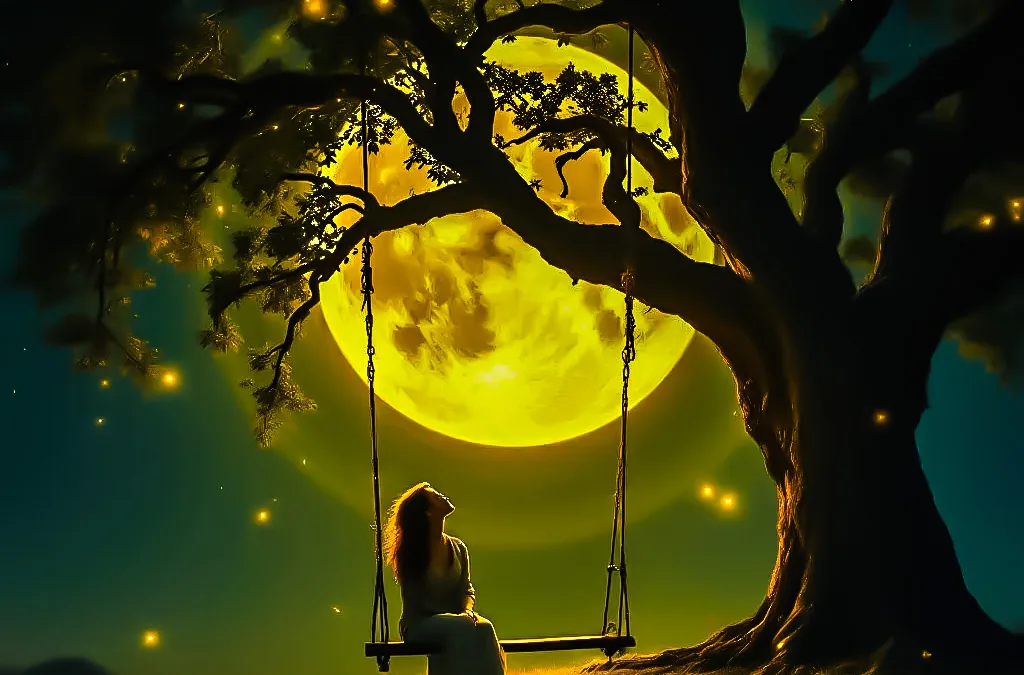As you rest on the swing beneath the great tree, each breath draws you deeper into balance — where movement becomes meditation and moonlight flows through every cell. Drifting through the luminous rings of the tree, you feel your own layers of being illuminated — physical, energetic, mental, emotional, and spiritual — each one brought into quiet alignment.