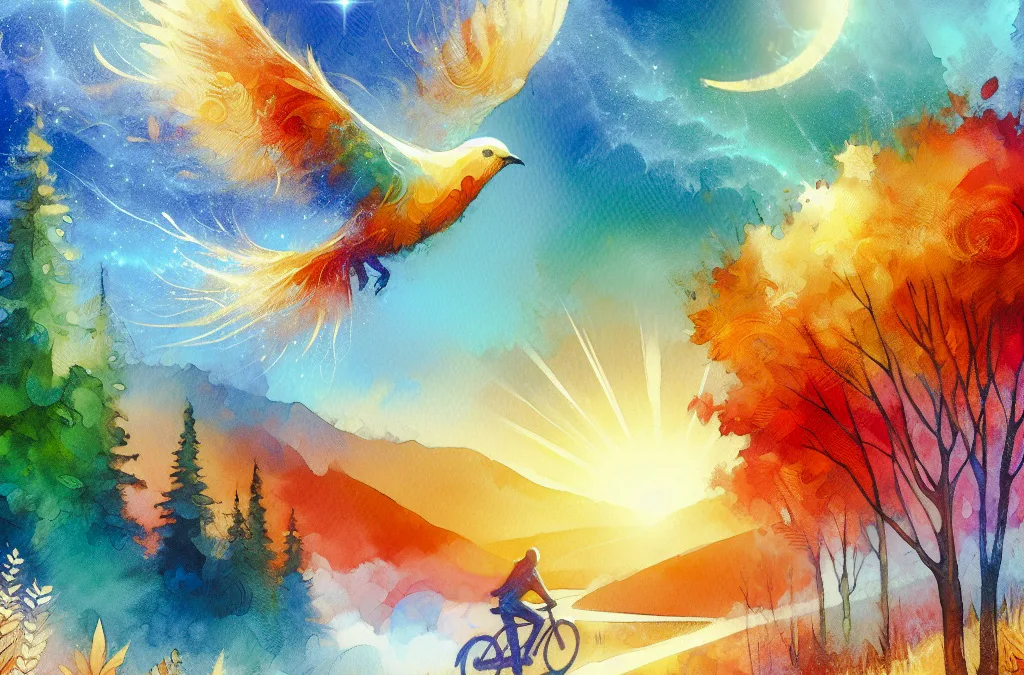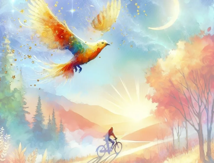 Pedaling through landscapes of light, you feel energy flowing freely through body and heart. The golden wings of inspiration lift you toward a new sense of aliveness and purpose. The New Moon’s quiet radiance stirs your inner spark — fresh energy rises, guiding you toward renewal and joy.