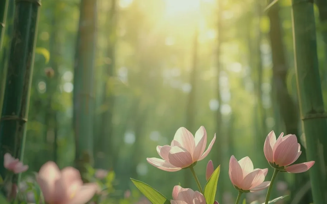 Your journey unfolds in the heart of a bamboo grove, where tall green stalks sway and fresh life fills the air. Resting deeply, your energy begins to rebalance, tension eases, and pathways within you clear so grounding and expansion can return